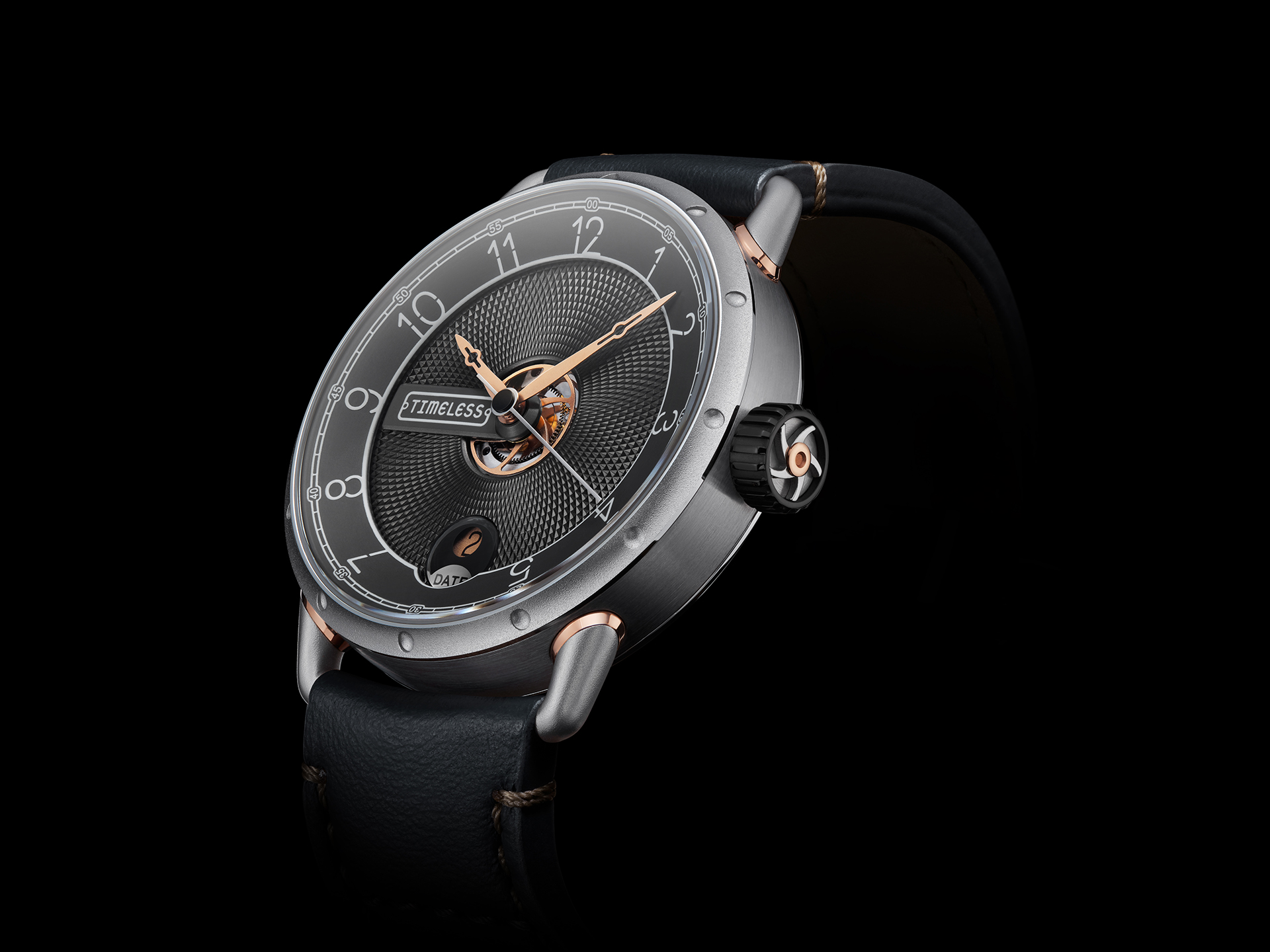 Premier modèle de la marque Timeless, ce garde-temps en acier orné de fins détails plaqués en or rose et d’un verre saphir bombé sied à tous.
