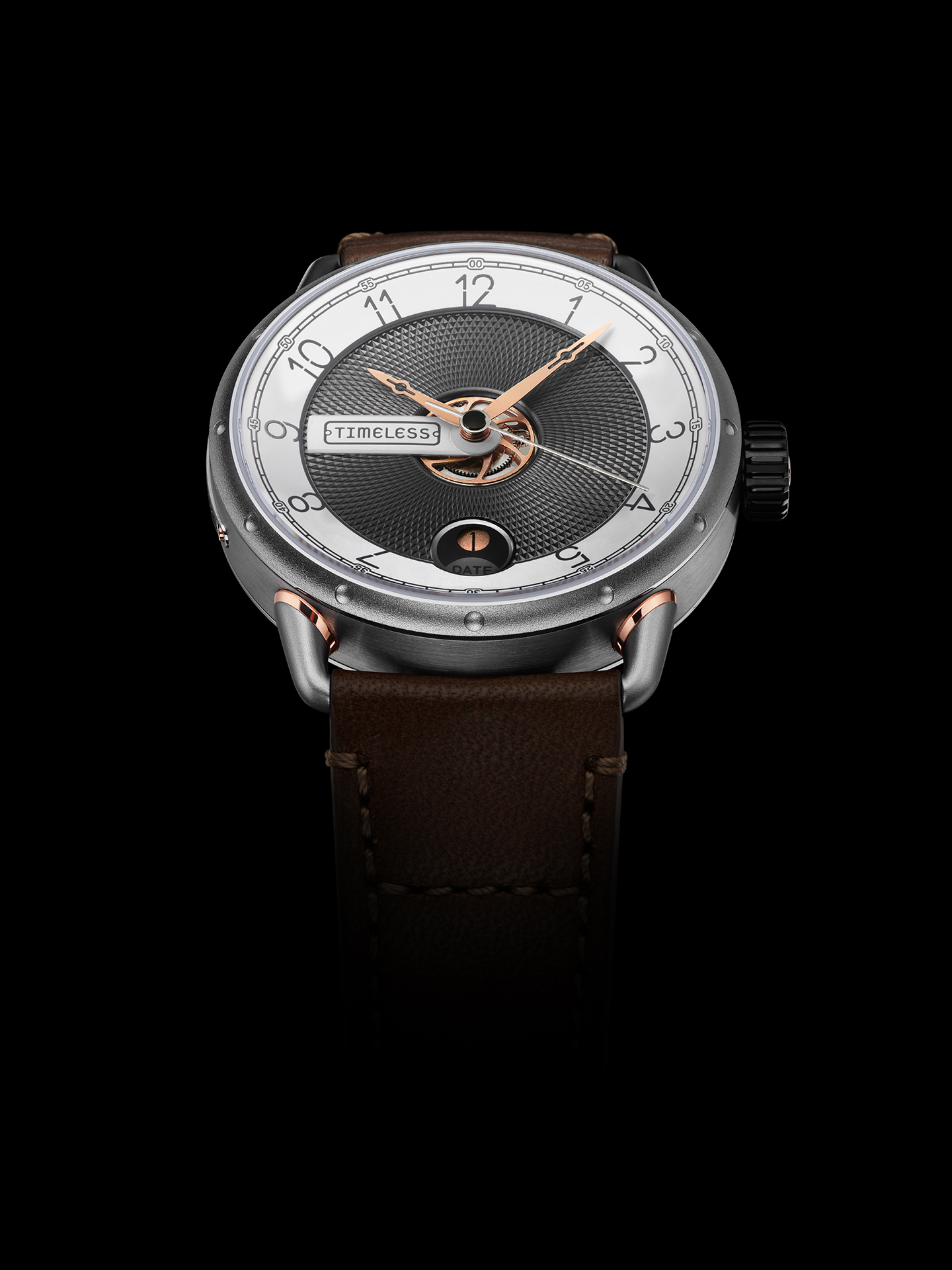 The first model of the Timeless brand, this steel timepiece is adorned with fine rose gold-plated details and a curved sapphire crystal that suits everyone.